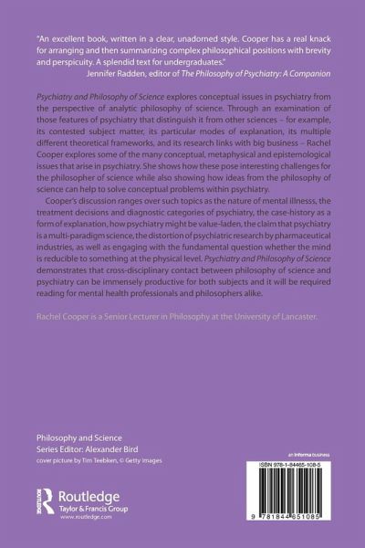 "Psychiatry and Philosophy of Science" explores conceptual issues in psychiatry from the perspective of analytic philosophy of science. Through an examination of those features of psychiatry that distinguish it from other sciences - for example, its contested subject matter, its particular modes of explanation, its multiple different theoretical frameworks, and its research links with big business - Rachel Cooper explores some of the many conceptual, metaphysical and epistemological issues that arise in psychiatry. She shows how these pose interesting challenges for the philosopher of science while also showing how ideas from the philosophy of science can help to solve conceptual problems within psychiatry. Cooper's discussion ranges over such topics as the nature of mental illnesses, the treatment decisions and diagnostic categories of psychiatry, the case-history as a form of explanation, how psychiatry might be value-laden, the claim that psychiatry is a multi-paradigm science, the distortion of psychiatric research by pharmaceutical industries, as well as engaging with the fundamental question whether the mind is reducible to something at the physical level. "Psychiatry and Philosophy of Science" demonstrates that cross-disciplinary contact between philosophy of science and psychiatry can be immensely productive for both subjects and it will be required reading for mental health professionals and philosophers alike.