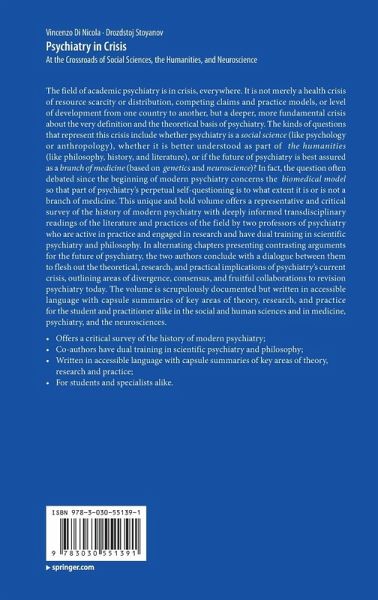 Psychiatry in Crisis as a Medical Discipline.- Methods for clinical evaluation in psychiatry: quantitative decomposition of narratives vs. qualitative approach. Reconstruction of the methodological discrepancies based on an exemplary case: major depressive disorder.- Psychiatric nosology revisited: at the crossroads of psychology and medicine. Categorical vs. dimensional; nomothetic vs. ideographic classification and nomenclature; post-modern perspectives.- Psychiatry and neuroscience: at the interface. How to incorporate scientific data from neuroscience without turning psychiatry into an applied branch of neurology.- Invited commentary.- Critical Psychiatry.- The beginning of the end of psychiatry: a philosophical archaeology. Psychology: introspection and consciousness. Foundations of modern psychiatry. Schizophrenia: the worm in psychiatry's apple.- The end of phenomenology. "Who killed Ellen West?" A critical review of Ludwig Binswanger's foundational case of existential analysis.- The end of psychiatry. "Psychiatry against itself. " A philosophical archaeology of antipsychiatry.- Invited commentary.- Renewal in Psychiatry: Stoyanov in Dialogue with Di Nicola. Invited commentary.- Afterword