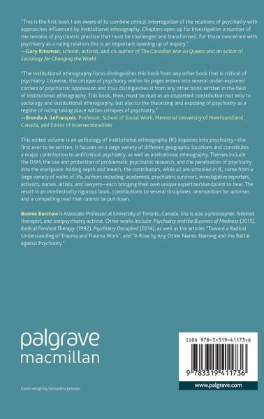 This edited volume is an anthology of institutional ethnography (IE) inquiries into psychiatry-the first ever to be written. It focuses on a large variety of different geographic locations and constitutes a major contribution to anti/critical psychiatry, as well as institutional ethnography. Themes include the DSM, the use and protection of problematic psychiatric research, the penetration of psychiatry into the workplace. Adding depth and breath, the contributors, while all are schooled in IE, come from a large variety of walks of life, authors including: academics, psychiatric survivors, investigative reporters, activists, nurses, artists, and lawyers-each bringing their own unique expertise/standpoint to bear. The result is an intellectually rigorous book, contributions to several disciplines, ammunition for activism, and a compelling read that cannot be put down.