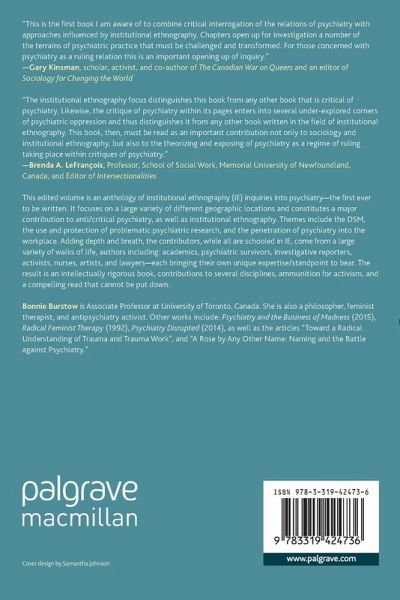 This edited volume is an anthology of institutional ethnography (IE) inquiries into psychiatry-the first ever to be written. It focuses on a large variety of different geographic locations and constitutes a major contribution to anti/critical psychiatry, as well as institutional ethnography. Themes include the DSM, the use and protection of problematic psychiatric research, the penetration of psychiatry into the workplace. Adding depth and breath, the contributors, while all are schooled in IE, come from a large variety of walks of life, authors including: academics, psychiatric survivors, investigative reporters, activists, nurses, artists, and lawyers-each bringing their own unique expertise/standpoint to bear. The result is an intellectually rigorous book, contributions to several disciplines, ammunition for activism, and a compelling read that cannot be put down.
