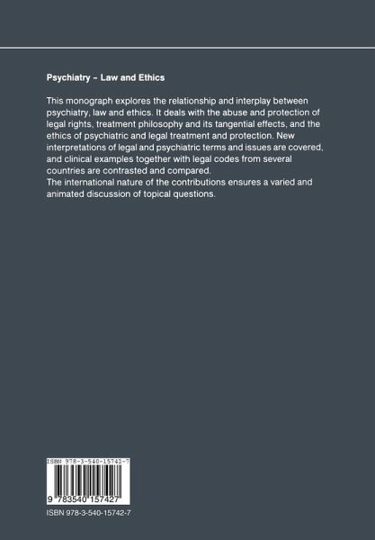 I. Introduction.- The Abnormal Approach to Abnormality.- II. Psychiatry and Society.- The Responsibilities of Psychiatrists to Society: The Dual Loyalties.- Political Psychiatry.- The Prostitution of Psychiatry: The 1930s in Germany and the 1980s in America.- The Role of Social Energy for Man.- III. Psychiatry and Law.- A. General.- Some Psychiatric Phenomena in Ancient Law.- The Evolutionary Relationship Between Psychiatry and the Law.- The Ideology of Entitlement: The Contemporary Function of Law and Its Application to Psychiatry.- Psychiatrist and Lawyer - Total Incompatibility?.- Post-Divorce Family Psychopathology: An Empirical Report.- B. Patients Rights.- Indexing Civil Commitment Criteria in Psychiatric Emergency Rooms.- The Rights of a Psychiatric Patient in a Mental Hospital.- Involuntary Psychiatric Hospitalization and Civil Liberties - The Case of Israel.- Civil Commitment Under Israeli Law.- Two Different Levels of Patient Autonomy.- The Rights of the Mental Patient Under Israeli Law.- Mental Health and Human Rights: Illegal Detention in Japan.- Clinical Perplexities in the Treatment of Treatment-Refusing Forensic Patients.- C. Psychiatry and Criminal Law.- Sentencing Offenders with Mental Disorders.- Psychiatric Evaluation of Criminal Accused.- Criminal Liability: Psychiatric Evaluation vs. Legal Tests.- The Insanity Defense: Current Law and Reform Options.- The Insanity Defense Under Nigerian Law.- Victimology Without a Victim.- Considerations Regarding the Legal Responsibilities of Schizophrenic Patients.- Violence After Severe Provocation.- Staff Injuries Caused by Psychiatric Patients.- D. The Expert Witness.- The Trap of the Medical Certificate.- The Psychiatric Case Register and Confidentiality.- Amnesia, Law, and Modern Psychiatry.- E. Childrenand the Aged.- Children's Accidents: Psychological and Legal Dimensions.- The Agony of Phillip Becker: Parental Autonomy Versus the Best Interests of the Child.- The Child in Court.- The Female Adolescent "Borderline": Psychiatric Disorder, Intellectual Anomaly, or Both?.- Legal Problems in Current Geriatric Psychiatry.- IV. Treatment and Rehabilitation.- Iatrogenic Syndromes and Disharmony in the Doctor-Doctor Relationship.- Ego-Structural Milieu Therapy in the Conception of Amnion's Theory of Dynamic Psychiatry.- Contraception and Abortion in Mentally Handicapped Female Adolescents Under German Law.- Victim Workers as Therapists for Incarcerated Sex Offenders.- V. Psychiatry and Ethics.- Ethics and Psychiatry.- Ethics and Depth Psychology.- The Right to Suicide - Ethical, Legal, and Psychiatric Approaches.- Ethical Issues in Forensic Psychiatry.- Research in Human Structurology.