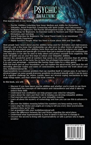 Five manuscripts in one book: Psychic Abilities: Unlocking Your Inner Medium and Ability for Divination, Telepathy, Astral Projection, Connecting with Spirit Guides, and Clairvoyance Telepathy for Beginners: The Psychic Development Guide to Telepathic Abilities Numerology for Beginners: An Essential Guide to Numbers and Their Meanings, Divination, and Astrology Astral Projection for Beginners: The Astral Travel Guide to an Intentional Out-of-Body Experience Highly Sensitive People: What You Need to Know about HSPs and Their Gifts Most people have heard about psychic abilities being used for divination and clairvoyance. However, only a few know that mediumship can also serve in other forms of spiritual work. This will help you unlock your abilities, hone them and use them to achieve your goals. Telepathy is a unique and special gift. It is more than just a method to help you communicate your thoughts; it can also be used to help others and protect yourself from negativity. This book will guide you on your first steps to unlock your telepathic abilities. Discover the wonderful world of numbers that needs a lot more attention than it's getting. You will become one of the lucky few to have this privileged information and be able to use it to your own advantage - somewhat like having cheat codes for a video game! With this fourth part as your foundation, you can explore the astral world, peel back the veil shrouding alternate realms and states of consciousness, and discover the truth about your rich, multidimensional life. Hypersensitivity is a common problem that can manifest itself in various ways. It can have a physical impact on some people (extreme sensitivity to physical stimuli), while it can be more of a cognitive challenge for others. Luckily, there are several coping mechanisms to help make things easier, and that's where this book comes in.