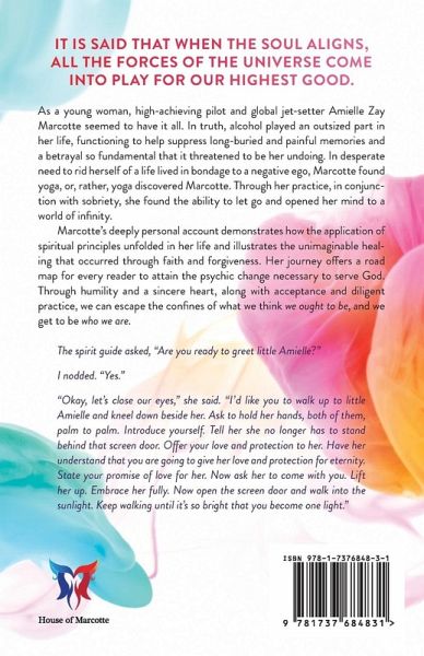 It is said that when the soul aligns, all the forces of the universe come into play for our highest good. As a young woman, high-achieving pilot and global jet-setter Amielle Zay Marcotte seemed to have it all. In truth, alcohol played an outsized part in her life, functioning to help suppress long-buried and painful memories and a betrayal so fundamental that it threatened to be her undoing. In desperate need to rid herself of a life lived in bondage to a negative ego, Marcotte found yoga, or, rather, yoga discovered Marcotte. Through her practice, in conjunction with sobriety, she found the ability to let go and opened her mind to a world of infinity. Marcotte's deeply personal account demonstrates how the application of spiritual principles unfolded in her life and illustrates the unimaginable healing that occurred through faith and forgiveness. Her journey offers a road map for every reader to attain the psychic change necessary to serve God. Through humility and a sincere heart, along with acceptance and diligent practice, we can escape the confines of what we think we ought to be, and we get to be who we are.