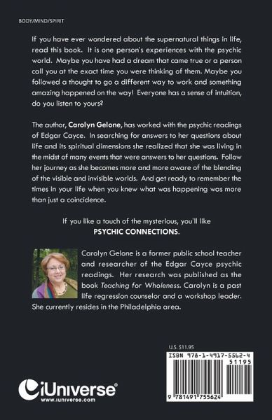If you have ever wondered about the supernatural things in life, read this book. It is one person's experiences with the psychic world. Maybe you have had a dream that came true or a person call you at the exact time you were thinking of them. Maybe you followed a thought to go a different way to work and something amazing happened on the way! Everyone has a sense of intuition, do you listen to yours? The author, Carolyn Gelone, has worked with the psychic readings of Edgar Cayce. In searching for answers to her questions about life and its spiritual dimensions she realized that she was living in the midst of many events that were answers to her questions. Follow her journey as she becomes more and more aware of the blending of the visible and invisible worlds. And get ready to remember the times in your life when you knew what was happening was more than just a coincidence. If you like a touch of the mysterious, you'll like PSYCHIC CONNECTIONS.