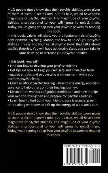 Most people don't know that their psychic abilities were given to them at birth. It seems odd, but it's true, we all have some magnitude of psychic abilities. The magnitude of your psychic abilities is proportional to your willingness to unlock them. Today, you're going to tap into your psychic powers by reading this book. In this book, valerie will show you the fundamentals of psychic development, psychic guidance, and how to unlock your psychic abilities. This is not your usual psychic book that talks about psychic theories. You will have actionable steps you can take in your daily life to increase your psychic abilities. In this book, you will:Find out how to develop your psychic abilities. Get tips on how to keep yourself safe and protected from negative entities and people who wish you harm while you perform psychic feats. Learn all about psychic healing - how to use energy and clairvoyance to help others on their healing journey. Discover the wonders of guided meditation and how it helps your mind to strengthen and prepare for psychic readings. Learn how to find out if your friend's aura is orange, green, or red along with how to pick up the energy of a person's aura. Most people don't know that their psychic abilities were given to them at birth. It seems odd, but it's true, we all have some magnitude of psychic abilities. The magnitude of your psychic abilities is proportional to your willingness to unlock them. Today, you're going to tap into your psychic powers by reading this book.