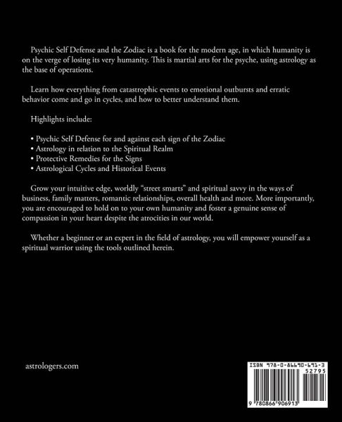 Psychic Self Defense and the Zodiac is a book for the modern age, in which humanity is on the verge of losing its very humanity. This is martial arts for the psyche, using astrology as the base of operations. Learn how everything from catastrophic events to emotional outbursts and erratic behavior come and go in cycles, and how to better understand them. Highlights include: ¿ Psychic Self Defense for and against each sign of the Zodiac ¿ Astrology in relation to the Spiritual Realm ¿ Protective Remedies for the Signs ¿ Astrological Cycles and Historical Events Grow your intuitive edge, worldly "street smarts" and spiritual savvy in the ways of business, family matters, romantic relationships, overall health and more. More importantly, you are encouraged to hold on to your own humanity and foster a genuine sense of compassion in your heart despite the atrocities in our world.