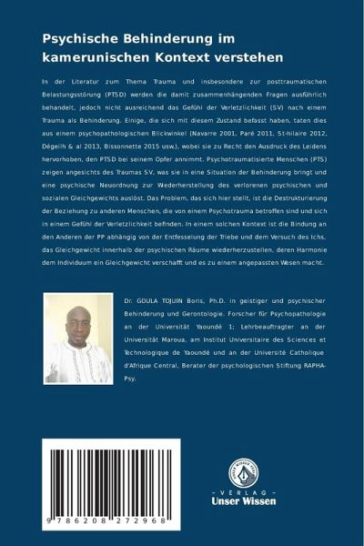 In der Literatur zum Thema Trauma und insbesondere zur posttraumatischen Belastungsstörung (PTSD) werden die damit zusammenhängenden Fragen ausführlich behandelt, jedoch nicht ausreichend das Gefühl der Verletzlichkeit (SV) nach einem Trauma als Behinderung. Einige, die sich mit diesem Zustand befasst haben, taten dies aus einem psychopathologischen Blickwinkel (Navarre 2001, Paré 2011, St-hilaire 2012, Dégeilh & al 2013, Bissonnette 2015 usw.), wobei sie zu Recht den Ausdruck des Leidens hervorhoben, den PTSD bei seinem Opfer annimmt. Psychotraumatisierte Menschen (PTS) zeigen angesichts des Traumas SV, was sie in eine Situation der Behinderung bringt und eine psychische Neuordnung zur Wiederherstellung des verlorenen psychischen und sozialen Gleichgewichts auslöst. Das Problem, das sich hier stellt, ist die Destrukturierung der Beziehung zu anderen Menschen, die von einem Psychotrauma betroffen sind und sich in einem Gefühl der Verletzlichkeit befinden. In einem solchen Kontextist die Bindung an den Anderen der PP abhängig von der Entfesselung der Triebe und dem Versuch des Ichs, das Gleichgewicht innerhalb der psychischen Räume wiederherzustellen, deren Harmonie dem Individuum ein Gleichgewicht verschafft und es zu einem angepassten Wesen macht.