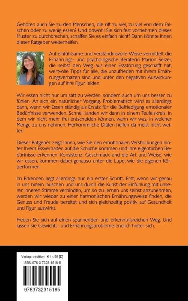 Gehören auch Sie zu den Menschen, die oft zu viel, zu viel von dem Falschenoder zu wenig essen? Und obwohl Sie sich fest vornehmen diesesMuster zu durchbrechen, schaffen Sie es einfach nicht? Dann könnte Ihnendieser Ratgeber weiterhelfen.Auf einfühlsame und verständnisvolle Weise vermittelt dieErnährungs- und psychologische Beraterin Marion Selzer,die selbst den Weg aus einer Essstörung geschafft hat,wertvolle Tipps für alle, die unzufrieden mit ihrem Ernährungsverhaltensind und unter den negativen Auswirkungenauf ihre Figur leiden.Wir essen nicht nur um satt zu werden, sondern auch um uns besser zufühlen. An sich ein natürlicher Vorgang. Problematisch wird es allerdingsdann, wenn wir Essen ständig als Ersatz für die Befriedigung emotionalerBedürfnisse verwenden. Schnell landen wir dann in einem Teufelskreis, indem wir nicht mehr frei entscheiden können, wann wir was, in welcherMenge zu uns nehmen. Herkömmliche Diäten helfen da meist nicht weiter.Dieser Ratgeber zeigt Ihnen, wie Sie den emotionalen Verstrickungen hinterIhrem Essverhalten auf die Schliche kommen und Ihre eigentlichen Bedürfnisseerkennen. Konsistenz, Geschmack und die Art und Weise, wiewir essen, kommen dabei genauso unter die Lupe, wie die eigenen Körperformen.Im Erkennen liegt allerdings nur ein erster Schritt. Erst, wenn wir genauin uns hinein lauschen und uns durch die Kunst der Einfühlung mit unsererinneren Stimme verbinden, um so zu lernen uns selbst anzunehmen,werden wir wieder zu einer harmonischen Ernährungsweise finden, dieGenuss und Freude bereitet und sich gleichzeitig positiv auf Gesundheitund Figur auswirkt.Freuen Sie sich auf einen spannenden und erkenntnisreichen Weg. Undlassen Sie Gewichts- und Ernährungsprobleme endlich hinter sich.