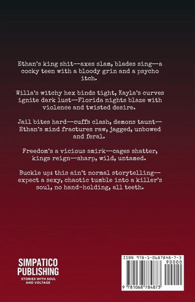 Ethan's king shit-ax slams, blades sing-a cocky teen with a bloody grin and a psycho itch. Willa's witchy hex binds tight, Kayla's curves ignite dark lust-Florida nights blaze with violence and twisted desire. Jail bites hard-cuffs clash, demons taunt-Ethan's mind fractures raw, jagged, unbowed, and feral. Freedom's a vicious smirk-cages shatter, kings reign-sharp, wild, untamed. Buckle up: this ain't normal storytelling-expect a sexy, chaotic tumble into a killer's soul, no hand-holding, all teeth.