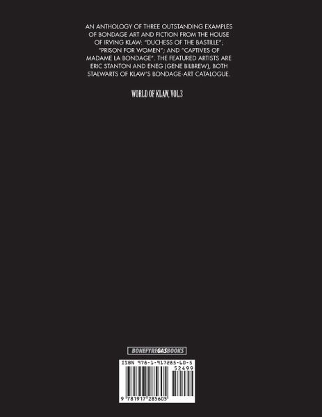 Irving Klaw was the legendary New York-based mail order merchant who, between around 1949 and his eventual prosecution for obscenity in 1966, produced thousands of films, photographic sets and printed booklets based on themes of fetishism, bondage, and sado-masochism. Although best-known for his discovery and promotion of the iconic bondage model Betty Page, Klaw's greatest legacy undoubtedly lies in his pioneering publishing work in the field of bondage illustration. PSYCHO¿GIRLS¿IN¿BONDAGE 3 is an anthology which collects three of the most intriguing and inventive examples of bondage art and fiction originally published by Klaw in the early 1950s. Duchess Of The Bastille (c.1952) by Eric Stanton is a typically outrageous fantasy inspired by the French Revolution but transposed to a timeless zone where a gang of girl freedom fighters are capturing and punishing members of the elite. Prison For Women (c.1954) by Eneg (Gene Bilbrew) features incarcerated females and sadistic wardens engaged in a continual power struggle expressed through dominance and submission. Eneg's Captives Of Madame La Bondage (c.1951-53) was a project which the artist worked on over two years, adding new pages to his fantasy of a French bondage mistress whose house of pain is filled with ingenious torture devices.