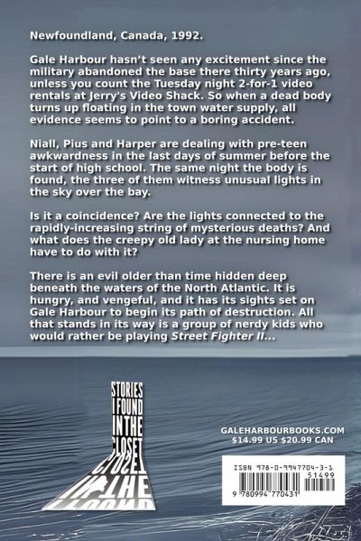 Newfoundland, Canada, 1992. Gale Harbour hasn't seen any excitement since the military abandoned the base there thirty years ago, unless you count the Tuesday night 2-for-1 video rentals at Jerry's Video Shack. So when a dead body turns up floating in the town water supply, all evidence seems to point to a boring accident. Niall, Pius and Harper are dealing with pre-teen awkwardness in the last days of summer before the start of high school. The same night the body is found, the three of them witness unusual lights in the sky over the bay. Is it a coincidence? Are the lights connected to the rapidly-increasing string of mysterious deaths? And what does the creepy old lady at the nursing home have to do with it? There is an evil older than time hidden deep beneath the waters of the North Atlantic. It is hungry, and vengeful, and it has its sights set on Gale Harbour to begin its path of destruction. All that stands in its way are a group of kids who would rather be playing Street Fighter II...