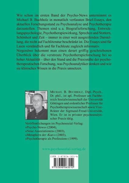 Wie schon im ersten Band der Psycho-News unternimmt es Michael B. Buchholz in monatlich verfassten Brief-Essays, den aktuellen Forschungsstand zu Psychoanalyse und Psychotherapie darzustellen. Themen sind u. a. Biografieforschung, Entwicklungspsychologie, Psychotherapiewirkung, Sprechen und Stottern, Schönheit und Zeit - immer in einer weit ausgreifenden Darstellung, die nicht auf Fachliteratur beschränkt ist. Die Essays sind für Laien verständlich und für Fachleute zugleich informativ.
