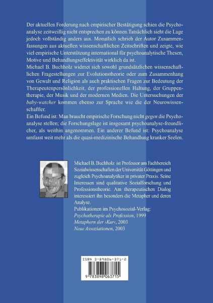 Michael Buchholz widmet sich sowohl grundsätzlichen wissenschaftlichen Fragestellungen zur Evolutionstheorie oder zum Zusammenhang von Gewalt und Religion als auch praktischen Fragen zur Bedeutung der Therapeutenpersönlichkeit, der professionellen Haltung, der Gruppentherapie, der Musik und der modernen Medien. Die Untersuchungen der baby-watcher kommen ebenso zur Sprache wie die der Neurowissenschaftler.