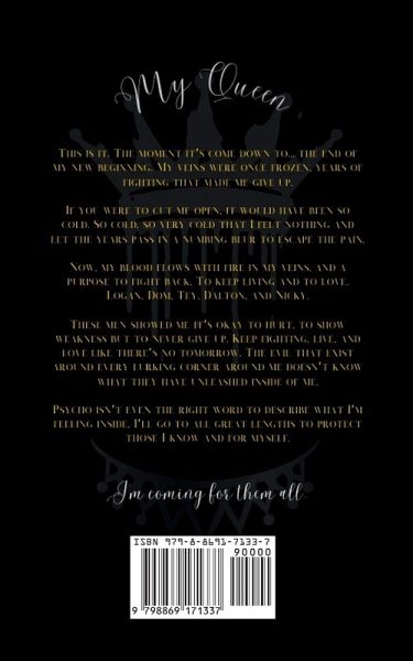 This is it. The moment it's come down to... the end of my new beginning. My veins were once frozen, years of fighting that made me give up. If you were to cut me open, it would have been so cold. So cold, so very cold that I felt nothing and let the years pass in a numbing blur to escape the pain. Now, my blood flows with fire in my veins, and I have a purpose to fight back. To keep living and to love. Logan, Dom, Tey, Dalton, and Nicky. These men showed me it's okay to hurt, to show weakness, but to never give up. Keep fighting, live, and love like there's no tomorrow. The evil that exists around every lurking corner around me doesn't know what they have unleashed inside of me. Psycho isn't even the right word to describe what I'm feeling inside. I'll go to all great lengths to protect those I know and for myself. I'm coming for them all...