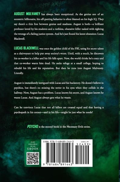 August Mulvaney has always been exceptional. As the genius son of an eccentric billionaire, his off-putting behavior is often blamed on his high IQ. They say there's a thin line between genius and madness. August is both-a brilliant professor loved by his students and a ruthless, obsessive killer tasked with righting the wrongs of a failing justice system. And he's just found his latest obsession: Lucas Blackwell. Lucas Blackwell was once the golden child of the FBI, using his secret talent as a clairvoyant to help put away society's worst. Until, with a touch, he discovers his co-worker is a killer and his life falls apart. Now, the world thinks he's crazy and that co-worker wants him dead. He seeks refuge at a small college, hoping to rebuild his life and his reputation. But then he runs into August Mulvaney. Literally. August is immediately intrigued with Lucas and his backstory. He doesn't believe in psychics, but there's no missing the terror in his eyes when they collide in the hallway. Now, August has a problem. Lucas knows his secret, and August knows he wants Lucas. And August always gets what he wants. Can he convince Lucas that not all killers are created equal and that having a psychopath in his corner-and in his life-might be just what he needs? Psycho is a fast-paced, thrill ride of a romance with an HEA and no cliffhangers. It features a psychopath hell-bent on romance and a disgraced FBI agent attempting to redeem himself. As always, there's gratuitous violence, very dark humor, and scenes so hot it will melt your kindle. This is book two in the Necessary Evils series. Each book follows a different couple.