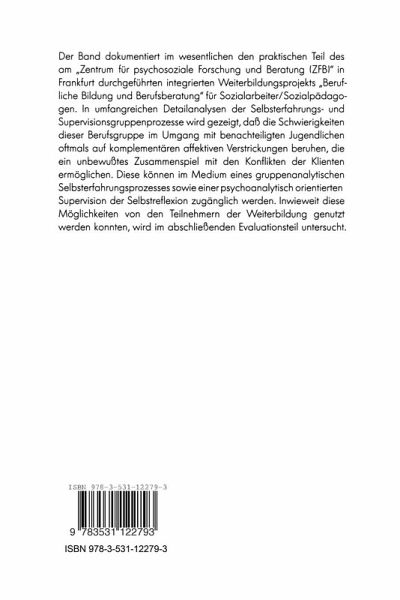 Einleitung: Zur Professionalisierung sozialer Arbeit: Psychoanalyse in der Weiterbildung von Betreuern marginalisierter Jugendlicher.- I. Psychoanalytische (gruppenanalytische) Gruppenselbsterfahrung in berufshomogenen Gruppen.- II. Der Selbsterfahrungsprozeß in Gruppe I: Zwischen Ohnmacht und Aggression.- 1. Besonderheiten des Settings.- 2. Der Gruppenverlauf.- III. Der Selbsterfahrungsprozeß der Gruppe II: Zeigen und Verstecken.- 1. Die Zusammensetzung der Gruppe II.- 2. "Wer gehört zur Gruppe?": Die Klärung der Frage als Faktor einer tendenziellen Konsolidierung.- 3. Die Phase der Identitätskrise.- 4. Die Überwindung der Aggressionsblockierung durch eine aggressive Intervention (Grenzsetzung).- 5. Die Schlußphase des Gruppenprozesses.- IV. Der Selbsterfahrungsprozeß der Gruppe III: Die innovative Gruppe.- 1. Die spezifischen Rahmenbedingungen der Gruppe III.- 2. Auswirkungen der spezifischen Rahmenbedingungen auf die Thematik der Gruppe.- 3. Nach der Thematisierung des Spaltungsphänomens "Kerngruppe" vs. "Randgruppe" wurde Abgrenzung möglich.- 4. Die Identitätsfindung rückte auch die Grenze (das Ende der Weiterbildung) ins Blickfeld.- 5. Die Schlußphase des Gruppenprozesses.- 6. Zusammenfassung des Gruppenprozesses.- 7. Resümee: Zur Professionalisierung sozialer Arbeit durch psychoanalytische Gruppenarbeit.- V. Supervision in der Fortbildung - Eine Fallstudie.- 1. Beziehungsdynamik als Mythos der Supervision.- 2. Der intermediäre Status der Supervision.- 3. Der Supervisionsprozeß - dargestellt an der Analyse von drei Sitzungsprotokollen.- 4. Die erste Sitzung.- 5. Die Fokussierung der Supervision.- 6. Berufsbiographische Dimensionen der Supervision.- 7. Nachwort.- VI. Psychoanalytisches Fallverständnis in der Sozialpädagogik.- 1.Probleme der Professionalisierung.- 2. Fallverständnis und Reinszenierung.- 3. Selbstdarstellung und Reinszenierung.- 4. Konfliktorientierte Falldarstellung.- 5. Progressive und regressive Position in der Supervision.- 6. Inszenierung der Selbstdarstellung.- 7. Interesse an der Klientel und Selbstreflexion.- VII. Evaluation der Weiterbildung: Zur Entwicklung psychosozialer Kompetenz.- 1. Methodologisches Selbstverständnis.- 2. Zur Organisation der Weiterbildung.- 3. Evaluationskonzept.- 4. Verlaufsanalysen.- 5. Bewertung der Weiterbildung als ganzer: Offene Fragen und Veränderungsperspektiven.- Literatur.- Autorinnen und Autoren.