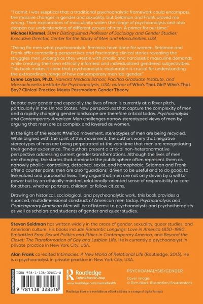 Debate over gender and especially the lives of men is currently at a fever pitch, particularly in the United States. New perspectives that capture the complexity of men and a rapidly changing gender landscape are therefore critical today. Psychoanalysis and Contemporary American Men challenges narrow stereotyped views of men by arguing that men are as complex and layered as women. In the light of the recent #MeToo movement, stereotypes of men are being recycled. While aligned with the spirit of this movement, the authors worry that negative stereotypes of men are being perpetrated at the very time that men are renegotiating their gender experience. The authors present a critical non-heteronormative perspective addressing current gender transformations. Although the lives of men are changing, the stories that dominate the public sphere often represent them as narrowly phallic-controlling, detached, sexist, and homophobic. Seidman and Frank offer a counter point: men are also "guardians" driven to be useful and to do good, to live valued and purposeful lives. They argue that men are not only driven by a will to power but by an ethically-minded, relationally-oriented sense of responsibility to care for others, whether partners, children, or fellow citizens. Drawing on historical, sociological, and psychoanalytic work, this book provides a nuanced, multidimensional construct of American men today. Psychoanalysis and Contemporary American Men will be of interest to psychoanalysts and psychotherapists as well as scholars and students of gender and queer studies.