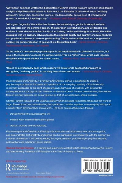 Psychoanalysis and Creativity in Everyday Life: Ordinary Genius is an attempt to create a psychoanalytic space for the quest and questions of our everyday creativity. Official creativity is normally applauded to the point of obscuring all other types of creativity, with detrimental consequences for our psychic life. However, as Gemma Corradi Fiumara demonstrates, the creative force of ordinary subjects can be as vigorous as that of our acclaimed, official accomplishments. Corradi Fiumara focuses on the unsung creativity which emerges from relationships and the world at large. She explores how understanding the operation of creative impulses in an everyday setting can crucially inform psychoanalytic clinical work. There are three main themes: Donald Winnicott's Psychoanalytic Will Melanie Klein and the Other Side of Genius Genius: Ordinary and Extraordinary.¿¿¿¿¿ Psychoanalysis and Creativity in Everyday Life advocates an inclusionary view of human genius, and demonstrates that creativity and genius can be manifested in everyday life with the ordinary as its focus of attention. It will be key reading for psychoanalysts, psychoanalytic psychotherapists, philosophers and scholars in social studies.