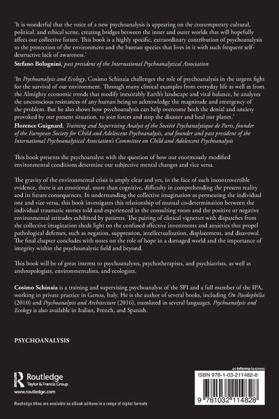 The gravity of the environmental crisis is amply clear and yet, in the face of such incontrovertible evidence, there is an emotional, more than cognitive, difficulty in comprehending the present reality and its future consequences. In understanding the collective imagination as permeating the individual one and vice versa, this book investigates this relationship of mutual co-determination between the individual traumatic stories told and experienced in the consulting room and the positive or negative environmental attitudes exhibited by patients. The pairing of clinical vignettes with dispatches from the collective imagination sheds light on the confused affective investments and anxieties that propel pathological defenses, such as negation, suppression, intellectualization, displacement, and disavowal. The final chapter concludes with notes on the role of hope in a damaged world and the importance of integrity within the psychoanalytic field and beyond.