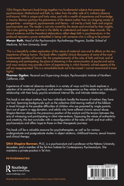 This book is not about mothers, but how individuals handle the trauma of mothers they have not had. Spanning backgrounds such as the collective child-rearing method of the kibbutz in Israel through to the possible difficulties of children who are parented by single parents, born out of sperm or egg donation, and adults who have suffered chronic sexual abuse, Shapira-Berman observes the precarious position of the analyst and the tension between the acts of witnessing and participating in client interventions. Espousing the values of authenticity and creativity, this text concludes with a reconfiguration of the roles of faith and trust within psychoanalysis and offers hope to those on their therapeutic journeys.