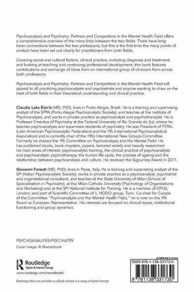 Cláudio Laks Eizirik (MD, PhD), lives in Porto Alegre, Brazil. He is a training and supervising analyst of the SPPA (Porto Alegre Psychoanalytic Society), and teaches at the Institute of Psychoanalysis, and works in private practice as psychoanalyst and psychotherapist. He is Professor Emeritus of Psychiatry at the Federal University of Rio Grande do Sul, where he teaches psychoanalysis and supervises residents of psychiatry. He was President of FEPAL (Latin American Psychoanalytic Federation) and the IPA (International Psychoanalytical Association) and is currently chair of the IPA's International New Groups Committee. Formerly he chaired the IPA Committee on Psychoanalysis and the Mental Field. He has published books, book chapters, papers, lectured widely and heavily researched his main areas of interest: psychoanalytic training, the clinical practice of psychoanalysis and psychoanalytic psychotherapy, the human life cycle, the process of ageing and the relationship between psychoanalysis and culture. He received the Sigourney Award in 2011. Giovanni Foresti (MD, PhD), lives in Pavia, Italy. He is training and supervising analyst of the SPI (Italian Psychoanalytic Society), works in private practice as a psychoanalyst, psychiatrist and organizational consultant, and teaches at the State University of Milan (School of Specialization in Psychiatry), at the Milan Catholic University (Psychology of Organizations and Marketing) and at the SPI National Institute for Training. He is a member of OPUS, London, and part of Scientific Committee of IL NODO group, Turin. Co-chair for Europe of the Committee "Psychoanalysis and the Mental Health Field," he is now on the IPA Board as European Representative. His interests are focused on clinical issues, institutional functioning and group dynamics.