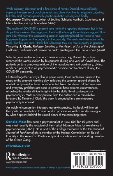 Selecting one sentence from each session every day, Donald Moss has recorded the words spoken by his patients during one year of 'Covid-time'. The patients conjure a moving mixture of the mundane and extraordinary, giving readers a perspective on psychoanalytic practice and treatment during the COVID-19 pandemic.