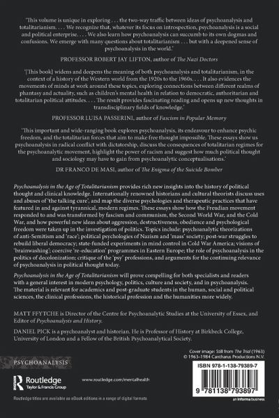 Psychoanalysis in the Age of Totalitarianism provides rich new insights into the history of political thought and clinical knowledge. In these chapters, internationally renowned historians and cultural theorists discuss landmark debates about the uses and abuses of 'the talking cure' and map the diverse psychologies and therapeutic practices that have featured in and against tyrannical, modern regimes. These essays show both how the Freudian movement responded to and was transformed by the rise of fascism and communism, the Second World War, and the Cold War, and how powerful new ideas about aggression, destructiveness, control, obedience and psychological freedom were taken up in the investigation of politics. They identify important intersections between clinical debate, political analysis, and theories of minds and groups, and trace influential ideas about totalitarianism that took root in modern culture after 1918, and still resonate in the twenty-first century. At the same time, they suggest how the emergent discourses of 'totalitarian' society were permeated by visions of the unconscious. Topics include: the psychoanalytic theorizations of anti-Semitism; the psychological origins and impact of Nazism; the post-war struggle to rebuild liberal democracy; state-funded experiments in mind control in Cold War America; coercive 're-education' programmes in Eastern Europe, and the role of psychoanalysis in the politics of decolonization. A concluding trio of chapters argues, in various ways, for the continuing relevance of psychoanalysis, and of these mid-century debates over the psychology of power, submission and freedom in modern mass society. Psychoanalysis in the Age of Totalitarianism will prove compelling for both specialists and readers with a general interest in modern psychology, politics, culture and society, and in psychoanalysis. The material is relevant for academics and post-graduate students in the human, social and political sciences, the clinical professions, the historical profession and the humanities more widely.