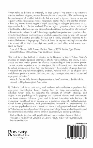 Foreword About this Book Diplomats and psychoanalysts Large-group identity shared prejudice chosen glories and chosen traumas Entitlement ideologies The Crusades the fall of Constantinople and the "Megali Idea" Traumatised large groups societal shifts and transgenerational transmissions Large-group regression and progression Unending mourning and memorials Political leaders' personalities Reactivation of a chosen trauma Intertwining old "memories" and affects with current ones Political propaganda suicide bombers and terrorism "Unofficial" diplomacy and psychoanalytic large-group psychology