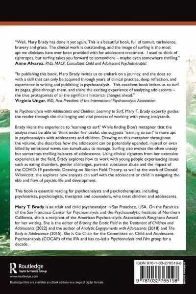 Brady likens the experience to 'learning to surf.' While finding Bion's metaphor that the analyst must be able to 'think under fire' useful, she suggests 'learning to surf' is more apt in psychoanalysis with adolescents and children. Drawing on this metaphor throughout the volume, she describes how the adolescent can be potentially upended, injured or even killed by emotional waves too tumultuous to manage. Surfing also evokes the often uneasy but sometimes thrilling balances of adolescence. Using clinical vignettes from her extensive experience in the field, Brady explores how to work with young people experiencing issues such as eating disorders, gender challenges, parental substance abuse and the impact of the COVID-19 pandemic. Drawing on Bionian Field Theory, as well as the work of Donald Winnicott, she explores how analysts can surf with the adolescent or child in navigating the ebb and flow of psychic life and development.