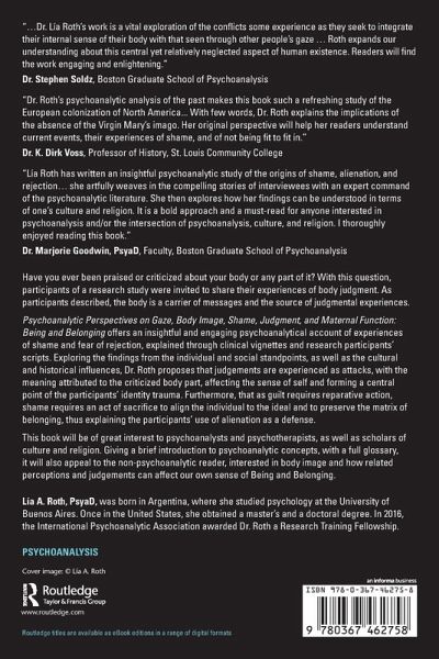 Have you ever been praised or criticized about your body or any part of it? With this question, participants of a research study were invited to share their experiences of body judgment. As participants described, the body is a carrier of messages and the source of judgmental experiences. Psychoanalytic Perspectives on Gaze, Body Image, Shame, Judgment and Maternal Function: Being and Belonging offers an insightful and engaging psychoanalytical account of experiences of shame and fear of rejection, explained through clinical vignettes and research participants' scripts. Exploring the findings from the individual and social standpoints, as well as the cultural and historical influences, Dr. Roth proposes that judgements are experienced as attacks, with the meaning attributed to the criticized body part, affecting the sense of self and forming a central point of the participants' identity trauma. Furthermore, that as guilt requires reparative action, shame requires an act of sacrifice to align the individual to the ideal and to preserve the matrix of belonging, thus explaining the participants' use of alienation as a defense. This book will be of great interest to psychoanalysts and psychotherapists, as well as scholars of culture and religion. Giving a brief introduction to psychoanalytic concepts, with a full glossary, it will also appeal to the non-psychoanalytic reader, interested in body image and how related perceptions and judgements can affect our own sense of Being and Belonging.