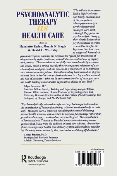 In Psychoanalytic Therapy as Health Care, a timely and trenchant consideration of the clash of values between managed care and psychoanalysis, contributors elaborate a thoughtful defense of the therapeutic necessity and social importance of contemporary psychoanalytic and psychodynamic approaches in the provision of mental health care. Part I begins with the question of where psychoanalytic treatments now stand in relation to health care; contributors offer explanations of the current state of affairs and consider possible directions of future developments. Part II looks directly at the conundrums that have resulted from the attempt to integrate psychotherapy and managed care, with contributors examining the ethical and legal dimensions of confidentiality, privacy, and reporting to third parties. Part III opens to wider consideration of the experiences of psychoanalysts under health care systems throughout the world. Finally, Part IV demonstrates the relevance of contemporary psychoanalytic approaches to a variety of contemporary patient populations, with contributors focusing on the applicability of analytically oriented treatment to AIDS patients, seriously disturbed young adults, and inner-city clinic patients. Collectively, the contributors to Psychoanalytic Therapy as Health Care convincingly refute the claim that psychoanalytically informed therapy is an esoteric treatment suited only to the "worried well." Drawing on a wide range of clinical and empirical evidence, they forcefully argue that contemporary psychoanalytic approaches are applicable to seriously distressed persons in a variety of treatment contexts. Failure to include such long-term therapies within health care delivery systems, they conclude, will deprive many patients of help they need - and help from which they can benefit in enduring ways that far transcend the limited treatment goals of managed care.
