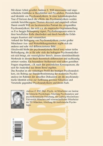 Mit dieser Arbeit gewährt Andreas E. Will interessante und ungewöhnliche Einblicke in Berufsleben und Privatleben, Persönlichkeit und Identität von Psychoanalytikern. In einer kaleidoskopischen Tour d Horizon durch die "Welt" des Psychoanalytikers werden zentrale berufsbezogene Themen skizziert und empirisch erfasst. Damit erstellt Will ein facettenreiches Portrait des zeitgemäßen Psychoanalytikers, das sich u.a. als empirische Gegendarstellung zu Eva Jaeggis Behauptung eignet, Psychotherapeuten seien in ihrer beruflichen Rolle überfordert und durch berufliche Erfahrungen frustriert und verunsichert.