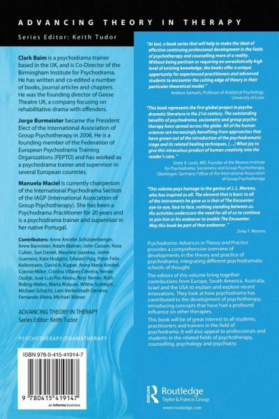Clark Baim is a psychodrama trainer based in the UK, specializing in work with offenders. He has written and co-edited a number of books, journal articles and chapters. He was the founding director of Geese Theatre UK, a company focusing on rehabilitative drama with offenders. Jorge Burmeister became the President Elect of the International Association of Group Psychotherapy in 2006. He is a founding member of the Federation of European and Mediterranean Psychodrama Training Organizations and has worked as a psychodrama trainer and supervisor in several European countries. Manuela Maciel is currently chairperson of the International Psychodrama Section of the IAGP (International Association of Group Psychotherapy). She has been a Psychodrama Practitioner for 20 years and is a psychodrama trainer and supervisor in her native Portugal