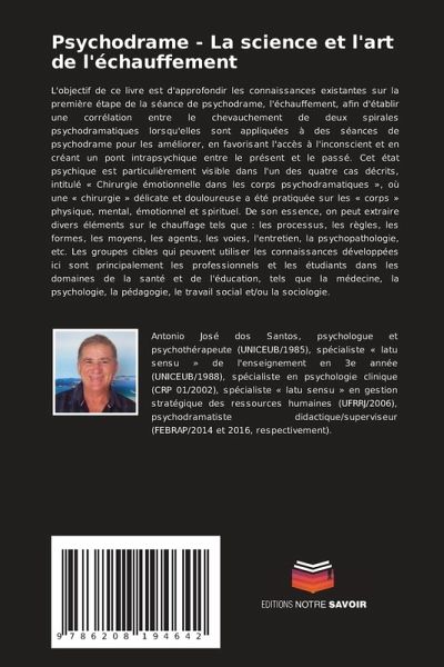 L'objectif de ce livre est d'approfondir les connaissances existantes sur la première étape de la séance de psychodrame, l'échauffement, afin d'établir une corrélation entre le chevauchement de deux spirales psychodramatiques lorsqu'elles sont appliquées à des séances de psychodrame pour les améliorer, en favorisant l'accès à l'inconscient et en créant un pont intrapsychique entre le présent et le passé. Cet état psychique est particulièrement visible dans l'un des quatre cas décrits, intitulé « Chirurgie émotionnelle dans les corps psychodramatiques », où une « chirurgie » délicate et douloureuse a été pratiquée sur les « corps » physique, mental, émotionnel et spirituel. De son essence, on peut extraire divers éléments sur le chauffage tels que : les processus, les règles, les formes, les moyens, les agents, les voies, l'entretien, la psychopathologie, etc. Les groupes cibles qui peuvent utiliser les connaissances développées ici sont principalement les professionnels et les étudiants dans les domaines de la santé et de l'éducation, tels que la médecine, la psychologie, la pédagogie, le travail social et/ou la sociologie.