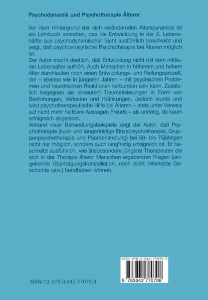 1 Einführung.- 2 Zur Psychotherapie Älterer in der Bundesrepublik.- Bisherige Entwicklung.- Jetzige Situation.- Derzeitige psychotherapeutische Versorgung Älterer.- Weiterführende Literatur zur Entwicklung in der Bundesrepublik.- 3 Altersbezogene Aussagen Freuds aus heutiger Sicht.- 4 Der Psychotherapeut - seine Schwierigkeiten mit Älteren.- Ab wann ist man "alt"? Begriffsbildung und Vorstellungen des Therapeuten.- Sich verändernde Beziehungen zwischen "Jung" und "alt" im Lebensverlauf.- Übertragungskonstellationen.- Normsetzungen im Behandlungsprozeß.- Potentielle Konfrontation mit früheren eigenen Verlusten.- Die fehlenden Kenntnisse der Alltagsgeschichte der Älteren.- Einfluß der nationalsozialistischen Vergangenheit.- Günstige Voraussetzungen für die (psychotherapeutische) Arbeit mit Älteren.- Weiterführende Literatur.- 5 Neurotische, Psychoreaktive und psychosomatische Erkrankungen Älterer.- Deflatorische Schwierigkeiten.- Neurotische und Psychoreaktive Erkrankungen.- Psychosomatische Erkrankungen und funktionelle Syndrome.- Altersgruppenspezifische Befunde und der Einfluß des Alterns.- Bisherige Einteilungsversuche.- Neurotische und Psychoreaktive Erkrankungen - ein klinisch-therapeutisch orientierter Einteilungsvorschlag.- 6 Zur Entwicklung im Lebensablauf.- Unsere (vorbewußten) Vorstellungen über den Lebenszyklus.- Historische Veränderungen des Lebenszyklus.- Psychoanalytisch begründete Erkenntnisse.- Klinische Relevanz.- Reifekriterien.- 7 Psychodynamische Sicht des Alterns.- Zur Zeitlosigkeit des Unbewußten.- Verkannte Triebwünsche.- und unzugestandene unbewußte Konflikte.- Traumatisierungen während des Alterns.- Die unveränderten Aufgaben des Ich.- Altern: Eine zweite Kindheit?.- 8 Zielsetzungen der PsychotherapieÄlterer.- Literatur zu den Zielsetzungen unterschiedlicher psychotherapeutischer Schulen.- 9 Erstinterview.- Zugang und Motivation.- Diagnostische Kriterien.- Besondere Schwierigkeiten - exemplarische Interviewausschnitte.- Diagnostische Schwerpunktsetzung.- Kriterien für Indikation und Prognose.- 10 Psychoanalytische Einzelpsychotherapie.- Bisherige Behandlungserfahrungen.- Fokal- und Kurzpsychotherapie.- Langfristige Einzelpsychotherapie.- Behandlungsaspekte.- Kasuistische Literatur.- 11 Modifikationen.- Weiterführende Literatur.- 12 Weitere Behandlungsformen.- Gruppenpsychotherapie.- Paartherapie.- Therapeutische (Sozial-) Arbeit.- Literatur zu Behandlungsformen.- 13 Behandlungskonzepte für weitere Patientengruppen.- Psychosomatische Hilfestellung für körperlich Erkrankte.- Hilfestellung für regressiv Erkrankte.- Hilfestellung für paranoid Erkrankte.- Hilfestellung für Suizidale.- 14 Behandlungsergebnisse.- Vielfältige Einflußfaktoren und schwierige Erfolgsdefinition.- Erreichbare Behandlungsergebnisse.- Sich verändernde Behandlungsziele.- "Unerreichte" Behandlungsziele.- Literatur.