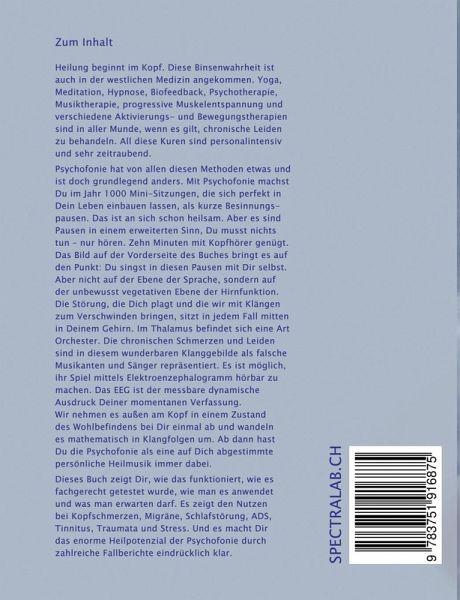 Heilung beginnt im Kopf. Diese Binsenwahrheit ist auch in der westlichen Medizin angekommen. Yoga, Meditation, Hypnose, Biofeedback, Psychotherapie, Musiktherapie, progressive Muskelentspannung und verschiedene Aktivierungs- und Bewegungstherapien sind in aller Munde, wenn es gilt, chronische Leiden zu behandeln. All diese Kuren sind personalintensiv und sehr zeitraubend. Psychofonie hat von allen diesen Methoden etwas und ist doch grundlegend anders. Mit Psychofonie machst Du im Jahr 1000 Mini-Sitzungen, die sich perfekt in Dein Leben einbauen lassen, als kurze Besinnungspausen. Das ist an sich schon heilsam. Aber es sind Pausen in einem erweiterten Sinn, Du musst nichts tun - nur hören. Zehn Minuten mit Kopfhörer genügt. Das Bild auf der Vorderseite des Buches bringt es auf den Punkt: Du singst in diesen Pausen mit Dir selbst. Aber nicht auf der Ebene der Sprache, sondern auf der unbewusst vegetativen Ebene der Hirnfunktion. Die Störung, die Dich plagt und die wir mit Klängen zum Verschwinden bringen, sitzt in jedem Fall mitten in Deinem Gehirn. Im Thalamus befindet sich eine Art Orchester. Die chronischen Schmerzen und Leiden sind in diesem wunderbaren Klanggebilde als falsche Musikanten und Sänger repräsentiert. Es ist möglich, ihr Spiel mittels Elektroenzephalogramm hörbar zu machen. Das EEG ist der messbare dynamische Ausdruck Deiner momentanen Verfassung. Wir nehmen es außen am Kopf in einem Zustand des Wohlbefindens bei Dir einmal ab und wandeln es mathematisch in Klangfolgen um. Ab dann hast Du die Psychofonie als eine auf Dich abgestimmte persönliche Heilmusik immer dabei. Dieses Buch zeigt Dir, wie das funktioniert, wie es fachgerecht getestet wurde, wie man es anwendet und was man erwarten darf. Es zeigt den Nutzen bei Kopfschmerzen, Migräne, Schlafstörung, ADS, Tinnitus, Traumata und Stress. Und es macht Dir das enorme Heilpotenzial der Psychofonie durch zahlreiche Fallberichte eindrücklich klar.