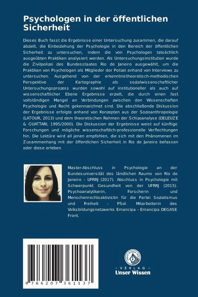 Dieses Buch fasst die Ergebnisse einer Untersuchung zusammen, die darauf abzielt, die Einbeziehung der Psychologie in den Bereich der öffentlichen Sicherheit zu untersuchen, indem die von Psychologen tatsächlich ausgeübten Praktiken analysiert werden. Als Untersuchungsinstitution wurde die Zivilpolizei des Bundesstaates Rio de Janeiro ausgewählt, um die Praktiken von Psychologen als Mitglieder der Polizei anhand von Interviews zu untersuchen. Ausgehend von der erkenntnistheoretisch-methodischen Perspektive der Kartographie als sozialwissenschaftlicher Untersuchungsprozess wurden sowohl auf institutioneller als auch auf wissenschaftlicher Ebene Ergebnisse erzielt, die durch einen fast vollständigen Mangel an Verbindungen zwischen den Wissenschaften Psychologie und Recht gekennzeichnet sind. Die abschließende Diskussion der Ergebnisse erfolgte anhand von Konzepten aus der Sozioanthropologie (LATOUR, 2013) und dem theoretischen Rahmen der Schizoanalyse (DELEUZE & GUATTARI, 1995/2000). Die Diskussion der Ergebnisse weist auf künftige Forschungen und mögliche wissenschaftlich-professionelle Verflechtungen hin. Die Lektüre wird all jenen empfohlen, die sich mit den Phänomenen im Zusammenhang mit der öffentlichen Sicherheit in Rio de Janeiro befassen oder diese erleben.