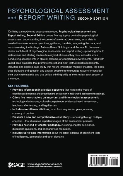 Outlining a step-by-step assessment model, Psychological Assessment and Report Writing, Second Edition covers five key topics central to psychological assessment: understanding the context of a referral; determining what data is needed to answer referral questions; gathering the data; integrating the data; and communicating the findings. Authors Karen Goldfinger and Andrew M. Pomerantz review each facet of psychological assessment and report writing-providing how-to instructions and alerting readers to a myriad of issues they must consider when conducting assessments in clinical, forensic, or educational environments. Filled with varied case examples that promote interest and meet instructional requirements, including one detailed case study that recurs throughout multiple chapters, the book uses sidebars and question and answer sections to encourage readers to consider their own case material and use critical thinking skills as they review each section of the model.