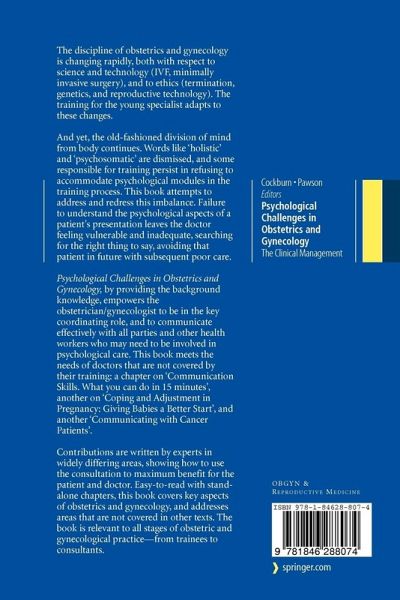 By providing the background knowledge, the book empowers the obstetrician/gynecologist to be in the key coordinating role, and to communicate effectively with all parties and health workers involved in psychological care. It meets the needs of doctors not covered by their training (e.g. Communication skills, coping and adjustment in pregnancy, communicating with cancer patients).