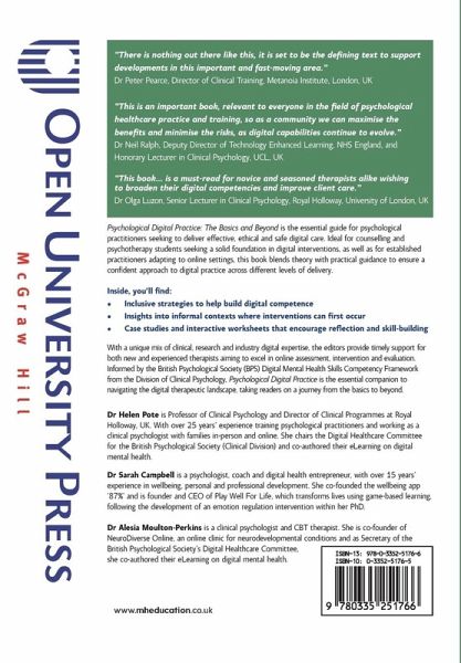 "There is nothing out there like this, it is set to be the defining text to support developments in this important and fast-moving area." Dr Peter Pearce, Director of Clinical Training, Metanoia Institute, London, UK "This is an important book, relevant to everyone in the field of psychological healthcare practice and training, so as a community we can maximise the benefits and minimise the risks, as digital capabilities continue to evolve." Dr Neil Ralph, Deputy Director of Technology Enhanced Learning, NHS England, and Honorary Lecturer in Clinical Psychology, UCL, UK "This book... is a must-read for novice and seasoned therapists alike wishing to broaden their digital competencies and improve client care." Dr Olga Luzon, Senior Lecturer in Clinical Psychology, Royal Holloway, University of London, UK Psychological Digital Practice: The Basics and Beyond is the essential guide for psychological practitioners seeking to deliver effective, ethical and safe digital care. Ideal for counselling and psychotherapy students seeking a solid foundation in digital interventions, as well as for established practitioners adapting to online settings, this book blends theory with practical guidance to ensure a confident approach to digital practice across different levels of delivery. Inside, you'll find: * Inclusive strategies to help build digital competence * Insights into informal contexts where interventions can first occur * Case studies and interactive worksheets that encourage reflection and skill-building With a unique mix of clinical, research and industry digital expertise, the editors provide timely support for both new and experienced therapists aiming to excel in online assessment, intervention and evaluation. Informed by the British Psychological Society (BPS) Digital Mental Health Skills Competency Framework from the Division of Clinical Psychology, Psychological Digital Practice is the essential companion to navigating the digital therapeutic landscape, taking readers on a journey from the basics to beyond. Dr Helen Pote is Professor of Clinical Psychology and Director of Clinical Programmes at Royal Holloway, UK. With over 25 years' experience training psychological practitioners and working as a clinical psychologist with families in-person and online. She chairs the Digital Healthcare Committee for the British Psychological Society (Clinical Division) and co-authored their eLearning on digital mental health. Dr Sarah Campbell is a psychologist, coach and digital health entrepreneur, with over 15 years' experience in wellbeing, personal and professional development. She co-founded the wellbeing app '87%' and is founder and CEO of Play Well For Life, which transforms lives using game-based learning, following the development of an emotion regulation intervention within her PhD. Dr Alesia Moulton-Perkins is a clinical psychologist and CBT therapist. She is co-founder of NeuroDiverse Online, an online clinic for neurodevelopmental conditions and as Secretary of the British Psychological Society's Digital Healthcare Committee, she co-authored their eLearning on digital mental health.