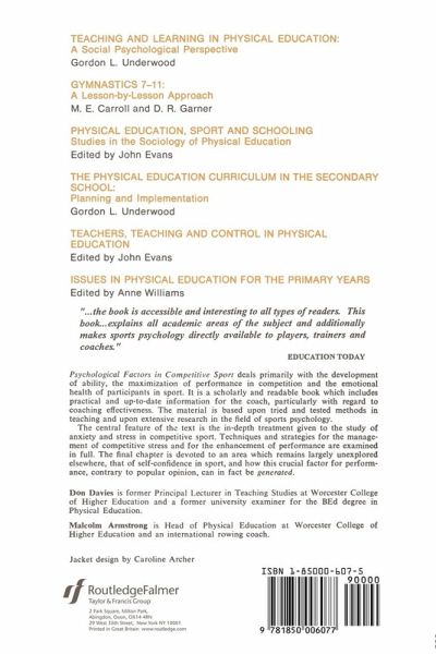 This book explains the importance of psychological factors for achievement and performance in competitive sport. It deals with the development of ability, maximization of performance in competition, emotional health, social adjustement and general well being of the participants in sport. The two main aims are firstly to select and outline ways in which young people can learn to become highly skilled and well adjusted sportsmen and secondly to describe the techniques by which players, having become highly skilled, can perform consistently well under pressure or stress. This book is based on tried and tested methods in teaching and on extensive research findings in the field of sport psychology. There is a strong bias towards the practical and most chapters contain specific guidelines to be followed and detailed practices to be undertaken, making it ideal as a practical text for teachers, coaches or as an aid to self-improvement in the competitor.