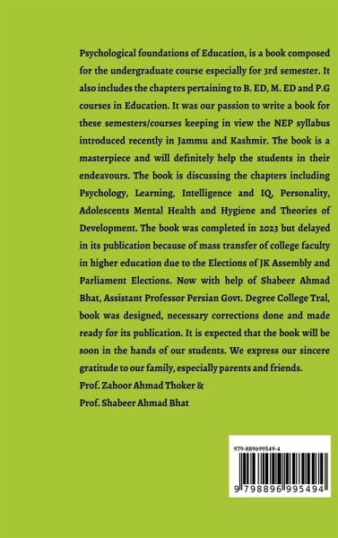 This book includes the contents concerning to Psychological foundations of Education, Psychology, Intelligence, Personality, Adolescents Mental Health and Hygiene and Theories of Development. Psychological foundations of Education, is a book composed for the undergraduate course especially for 3rd semester. It also includes the chapters pertaining to B. ED, M. ED and P.G courses in Education. It was our passion to write a book for these semesters/courses keeping in view the NEP syllabus introduced recently in Jammu and Kashmir. The book is a masterpiece and will definitely help the students in their endeavours. The book is discussing the chapters including Psychology, Learning, Intelligence and IQ, Personality, Adolescents Mental Health and Hygiene and Theories of Development Zahoor Ahmad and Shabeer Ahmad