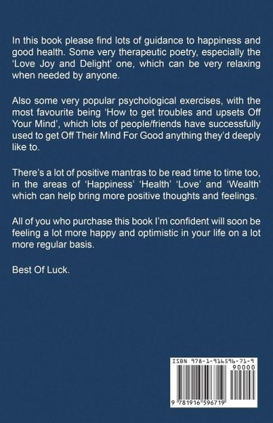 In this book please find lots of guidance to happiness and good health. Some very therapeutic poetry, especially the 'Love Joy and Delight' one, which can be very relaxing when needed by anyone. Also some very popular psychological exercises, with the most favourite being 'How to get troubles and upsets Off Your Mind', which lots of people/friends have successfully used to get Off Their Mind For Good anything they'd deeply like to. There's a lot of positive mantras to be read time to time too, in the areas of 'Happiness' 'Health' 'Love' and 'Wealth' which can help bring more positive thoughts and feelings. All of you who purchase this book I'm confident will soon be feeling a lot more happy and optimistic in your life on a lot more regular basis. Best Of Luck.