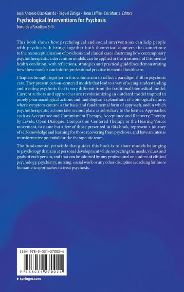 Chapters brought together in this volume aim to reflect a paradigm shift in psychosis care. They present person-centered models that lead to a way of seeing, understanding and treating psychosis that is very different from the traditional biomedical model. Current authors and approaches are revolutionizing an outdated model trapped in purely pharmacological actions and tautological explanations of a biological nature, where symptom control is the basic and fundamental form of approach, and in which psychotherapeutic actions take second place as subsidiary to the former. Approaches such as Acceptance and Commitment Therapy, Acceptance and Recovery Therapy by Levels, Open Dialogue, Compassion-Centered Therapy or the Hearing Voices movement, to name but a few of those presented in this book, represent a journey of self-knowledge and learning for those recovering from psychosis, and have an intense transformative potential for the therapeutic team.