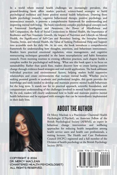 In an era where mental health challenges are increasingly widespread, this pioneering publication offers readers practical, evidence-based strategies to cultivate psychological resilience and promote positive mental health behaviours. Drawing on research from health psychology, cognitive behavioural therapy, positive psychology, and neuroscience, it outlines a comprehensive framework for understanding and enhancing mental well-being. The book clarifies complex psychological concepts such as emotional intelligence, mindfulness, self-compassion, the significance of social connections in mental health, the importance of resilience and post-traumatic growth, the impact of nutrition and lifestyle on mental health, the necessity of self-care and boundary-setting, the relationship between trauma, stress, and mental health, and the value of seeking professional assistance, transforming these ideas into accessible tools for everyday life. At its core, it presents a thorough framework that explains the interconnections among thoughts, emotions, and behaviours. Readers are taught practical, emotional regulation, stress management, and cognitive restructuring techniques, all grounded in neuroplasticity and habit formation research. From morning routines to evening reflective practices, each chapter constructs a comprehensive toolkit for psychological well-being. What sets this publication apart is its focus on sustainability. Rather than suggesting temporary solutions, readers learn how to enact lasting positive change through evidence-based strategies and real-world applications. The book addresses individual practices and environmental factors, helping readers foster supportive relationships and create environments conducive to mental health. Whether pursuing personal growth or seeking academic and professional insights, this guide provides individuals with the knowledge and tools necessary to cultivate and sustain positive mental health behaviours over the long term. It is notable for its practical methodology, scientific foundations, and compassionate recognition of the challenges associated with enhancing mental health. Ultimately, readers will understand how to cultivate and maintain positive mental health behaviours, fully equipped with strategies that can be seamlessly integrated into their daily lives.