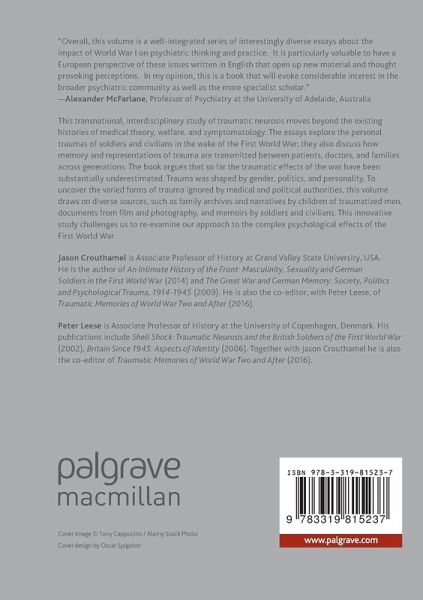 This transnational, interdisciplinary study of traumatic neurosis moves beyond the existing histories of medical theory, welfare, and symptomatology. The essays explore the personal traumas of soldiers and civilians in the wake of the First World War; they also discuss how memory and representations of trauma are transmitted between patients, doctors and families across generations. The book argues that so far the traumatic effects of the war have been substantially underestimated. Trauma was shaped by gender, politics, and personality. To uncover the varied forms of trauma ignored by medical and political authorities, this volume draws on diverse sources, such as family archives and narratives by children of traumatized men, documents from film and photography, memoirs by soldiers and civilians. This innovative study challenges us to re-examine our approach to the complex psychological effects of the First World War.