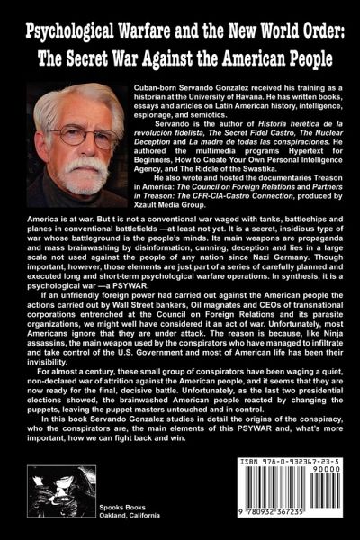 Psychological Warfare and the New World Order: The Secret War Against the American People by Servando Gonzalez.. ISBN: 978-0-932367-23-5 Book Description America is at war. But this is not a conventional war waged with tanks, battleships and planes in conventional battlefields ¿at least not yet. It is a secret, insidious type of war whose battleground is the people¿s minds. Its main weapons are mind viruses disseminating propaganda and mass brainwashing by disinformation, cunning, deception and lies in a large scale not used against any people since Nazi Germany. Though important, these elements are just part of a series of carefully planned and executed long and short-term psychological warfare operations. In synthesis, it is a psychological war ¿a PSYWAR. If an unfriendly foreign power had carried out against the American people the actions carried out by Wall Street bankers, Oil magnates and CEOs of transnational corporations entrenched at the Council on Foreign Relations and its parasite organizations, we might well have considered it an act of war. Unfortunately, most Americans ignore that they are under attack. The reason is because, like Ninja assassins, the main weapon used by the conspirators who have managed to infiltrate and take control of the U.S. Government and most of American life has been their invisibility. For almost a century, this small group of conspirators have been waging a quiet, non-declared war of attrition against the American people, and it seems that they are now ready for the final, decisive battle. Unfortunately, as the last two presidential elections showed, the brainwashed American people reacted by changing the puppets, leaving the puppet masters in control. This book studies in detail the origins of the conspiracy, who the conspirators are, the main elements of this PSYWAR and, what¿s more important, how we can fight back and win. Editorial Reviews Servando Gonzalez' exposé of the Alien Queen, known as the CFR, could easily alter the future of Western civilization and America for the good. These are times when a single man may make great contributions to the cause of human dignity and freedom. ¿Kevin E. Abrams, co-author with Scott Lively of The Pink Swastika. Thoreau wrote, ¿There are a thousand hacking at the branches of evil to one who is striking at the root.¿ Servando Gonzalez didn¿t waste any time hacking at the branches, and reveals the very crooked roots of evil. This is a most impressive book. A must read. ¿G. Edward Griffin, author of The Creature from Jekyll Island. Servando Gonzalez has studied in detail the men and organizations that rule the world.. It is one of the most important books of this decade. Read it and learn about the invisible forces that direct the course of world affairs ¿Stanley Monteith, author of Brotherhood of Darkness. Read this book. It not only tells you what¿s happening today but, with very well chosen historical perspective, it lets you look down the road of the recent past for proof of what it says. That is the best way to learn to look at the future in order to fathom what is coming your way. And what is coming our way is riddled with grave dangers, pitfalls and perils. ¿Adrian Salbuchi, author of El cerebro del mundo: la cara oculta de la globalización. Servando Gonzalez, masterly divulges the machinations behind many historical and contemporary events and he reveals who is really managing the presidential puppet strings. The new American Revolution is a conflict without guns. Rather, the ammunition is lies and psychological warfare and every American citizen is a target. It¿s a fabulous book, a must-read! ¿Deanna Spingola, author of When the Power Elite Rules.