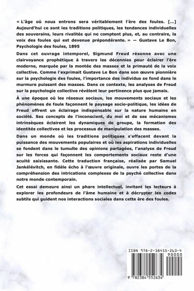 L'âge où nous entrons sera véritablement l'ère des foules. [...] Aujourd'hui ce sont les traditions politiques, les tendances individuelles des souverains, leurs rivalités qui ne comptent plus, et, au contraire, la voix des foules qui est devenue prépondérante. - Gustave Le Bon, Psychologie des foules.Dans cet ouvrage intemporel, Sigmund Freud résonne avec une clairvoyance prophétique à travers les décennies pour éclairer l'ère moderne, marquée par la montée des masses et la primauté de la voix collective. Comme l'exprimait Gustave Le Bon dans son uvre pionnière sur la psychologie des foules, l'importance des individus se fond dans le murmure puissant des masses. Dans ce contexte, les analyses de Freud sur la psychologie collective révèlent leur pertinence plus que jamais.À une époque où les réseaux sociaux, les mouvements sociaux et les phénomènes de foule façonnent le paysage socio-politique, les idées de Freud offrent un éclairage indispensable sur la nature humaine en société. Ses concepts de l'inconscient, du moi et de ses mécanismes intrinsèques éclairent les dynamiques de groupe, la formation des identités collectives et les processus de manipulation des masses.Dans un monde où les traditions politiques s'effacent devant la puissance des mouvements populaires et où les aspirations individuelles se fondent dans le tumulte des opinions partagées, l'analyse de Freud sur les forces qui façonnent les comportements sociaux reste d'une acuité saisissante. Cette traduction française, réalisée par Samuel Jankélévitch, en fidèle écho à l'uvre originale, ouvre les portes de la compréhension des intrications complexes de la psyché collective dans notre monde contemporain.Cet essai demeure ainsi un phare intellectuel, invitant les lecteurs à explorer les profondeurs de l'âme humaine et à décrypter les codes subtils qui guident nos interactions sociales dans cette ère des foules.