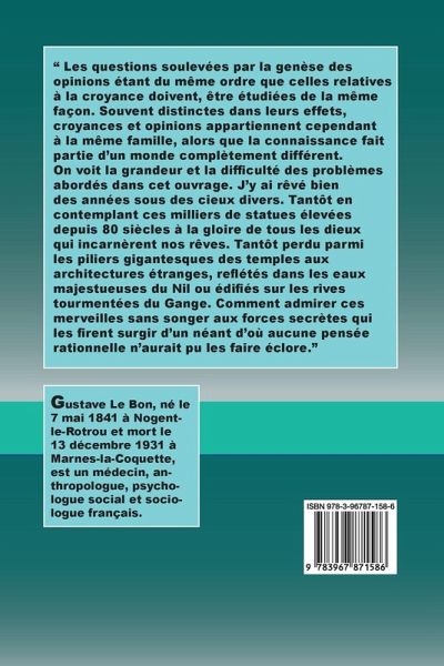 " Les questions soulevées par la genèse des opinions étant du même ordre que celles relatives à la croyance doivent, être étudiées de la même façon. Souvent distinctes dans leurs effets, croyances et opinions appartiennent cependant à la même famille, alors que la connaissance fait partie d’un monde complètement différent. On voit la grandeur et la difficulté des problèmes abordés dans cet ouvrage. J’y ai rêvé bien des années sous des cieux divers. Tantôt en contemplant ces milliers de statues élevées depuis 80 siècles à la gloire de tous les dieux qui incarnèrent nos rêves. Tantôt perdu parmi les piliers gigantesques des temples aux architectures étranges, reflétés dans les eaux majestueuses du Nil ou édifiés sur les rives tourmentées du Gange. Comment admirer ces merveilles sans songer aux forces secrètes qui les firent surgir d’un néant d’où aucune pensée rationnelle n’aurait pu les faire éclore."