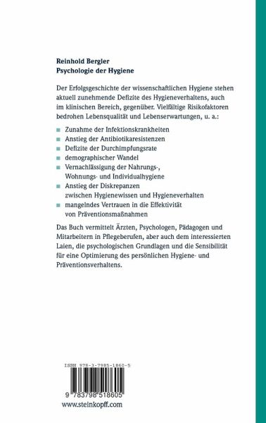 Die wissenschaftliche Hygiene ist eine Erfolgsgeschichte. Dennoch lassen sich aktuell Defizite im Hygieneverhalten feststellen - auch im klinischen Bereich. Dies birgt Risiken wie etwa die Zunahme von Infektionskrankheiten oder von Antibiotikaresistenzen. Das Buch sensibilisiert Ärzte, Psychologen, Pädagogen und Mitarbeiter in Pflegeberufen, aber auch interessierte Laien für das Thema und vermittelt die notwendigen psychologischen Grundlagen für eine Optimierung des persönlichen Hygiene- und Präventionsverhaltens.